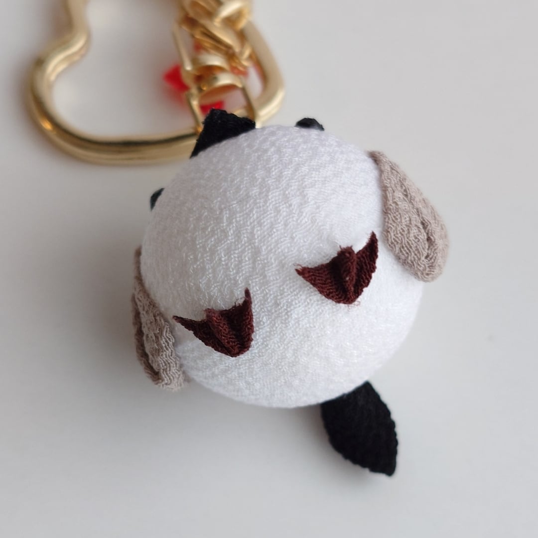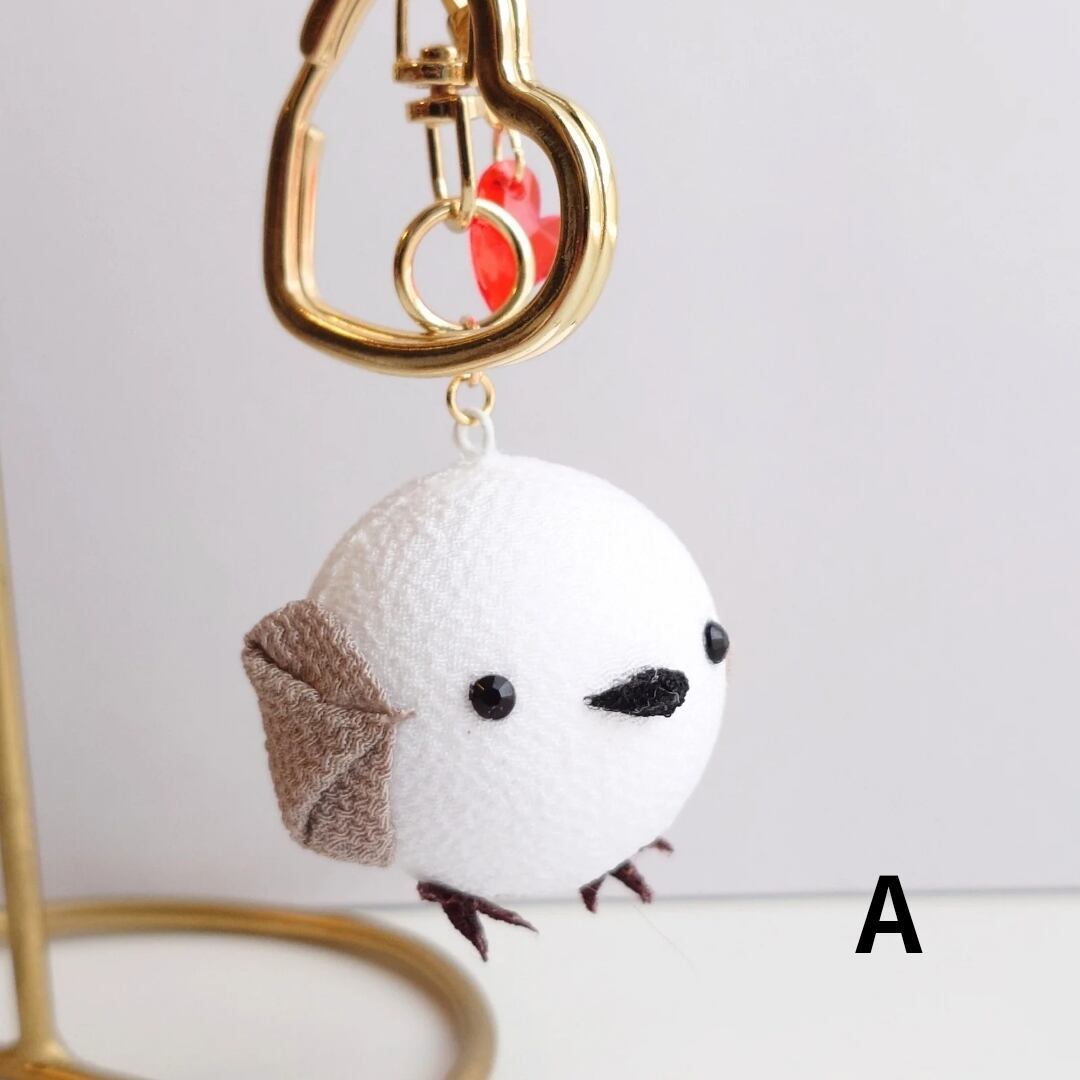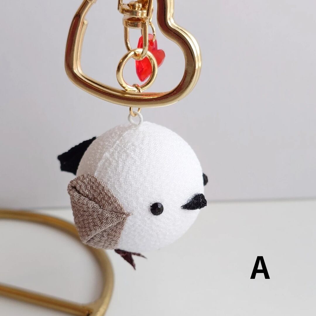 つまみ細工で作ったシマエナガのキーホルダー。