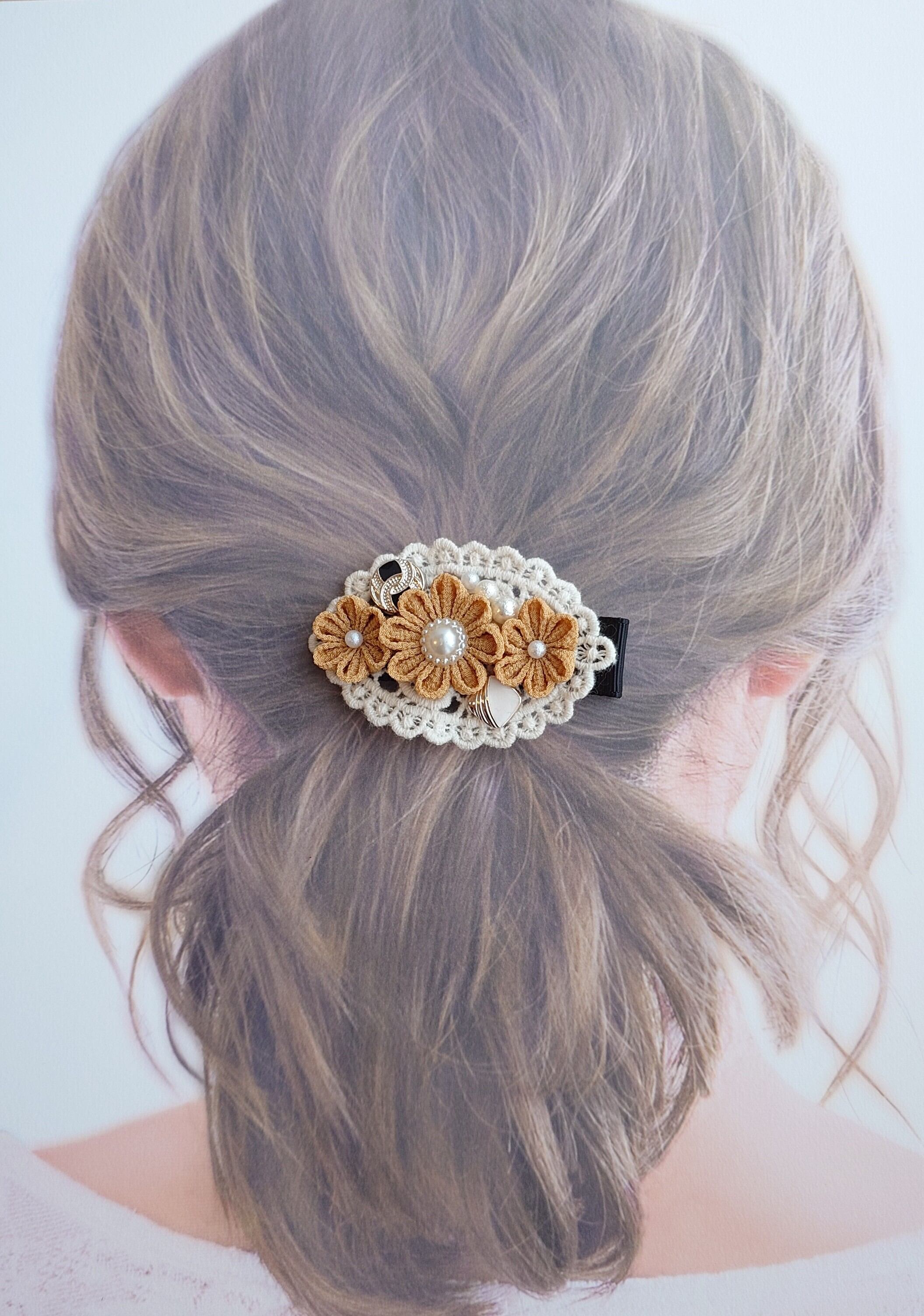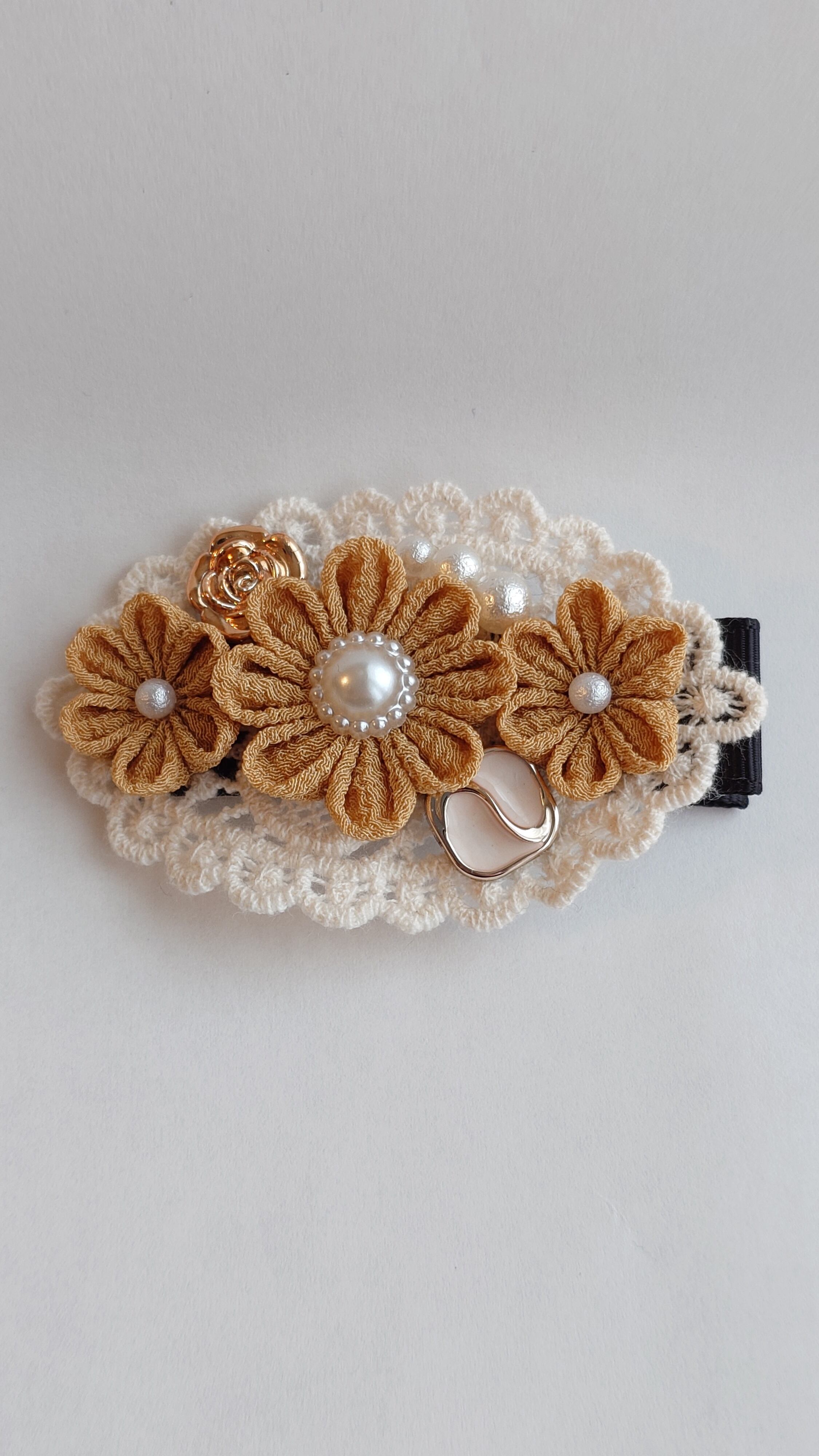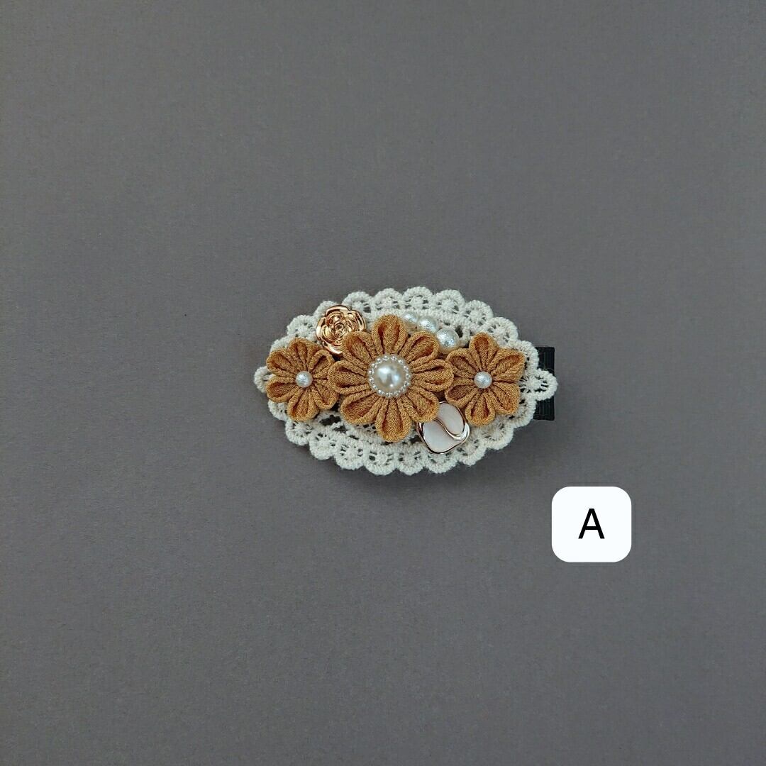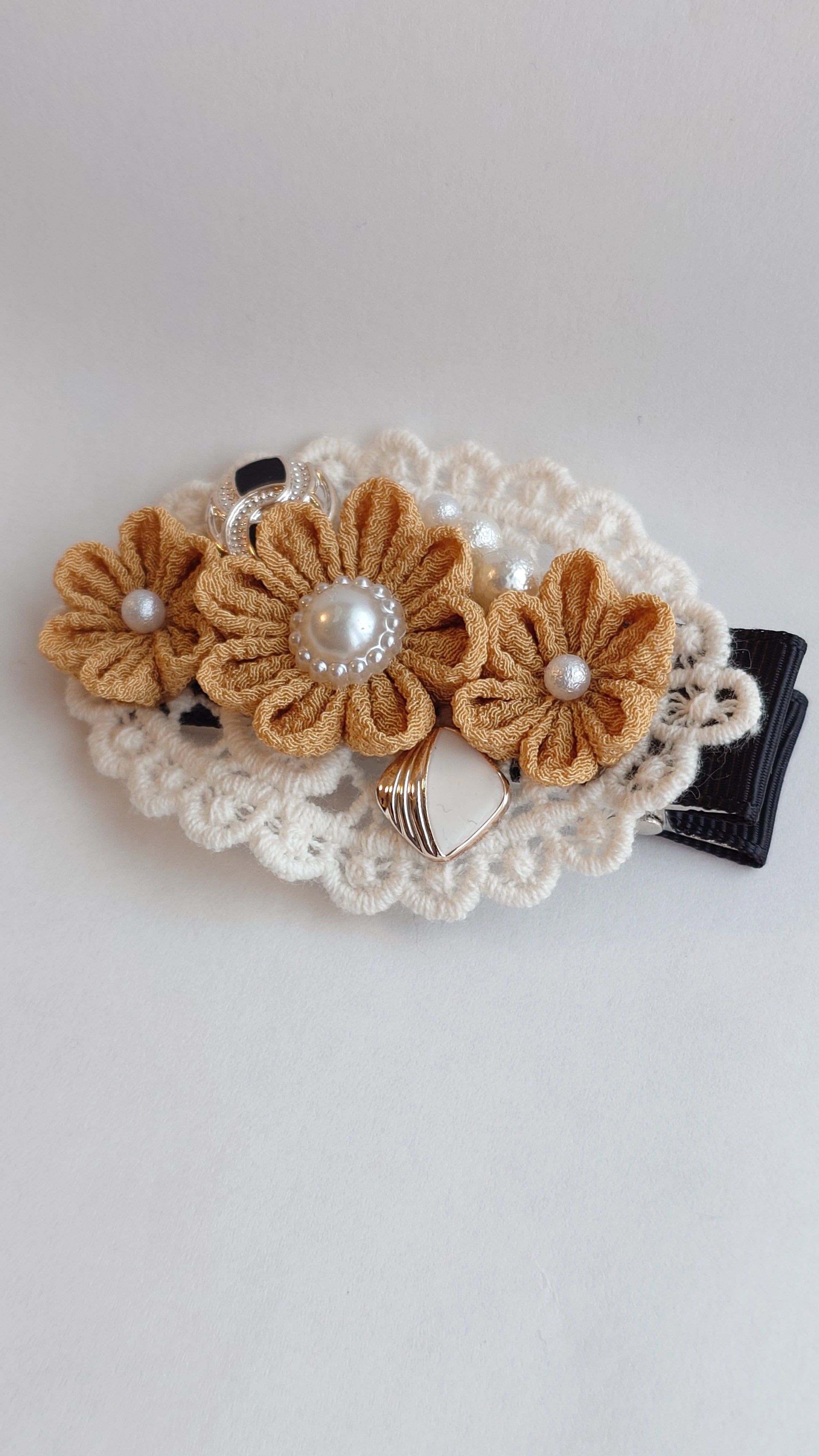 【素材】レーヨン(つまみ細工)、化繊(レース)、ポリエステル(リボン)、プラスチックパール、ボタン、クリップ金具