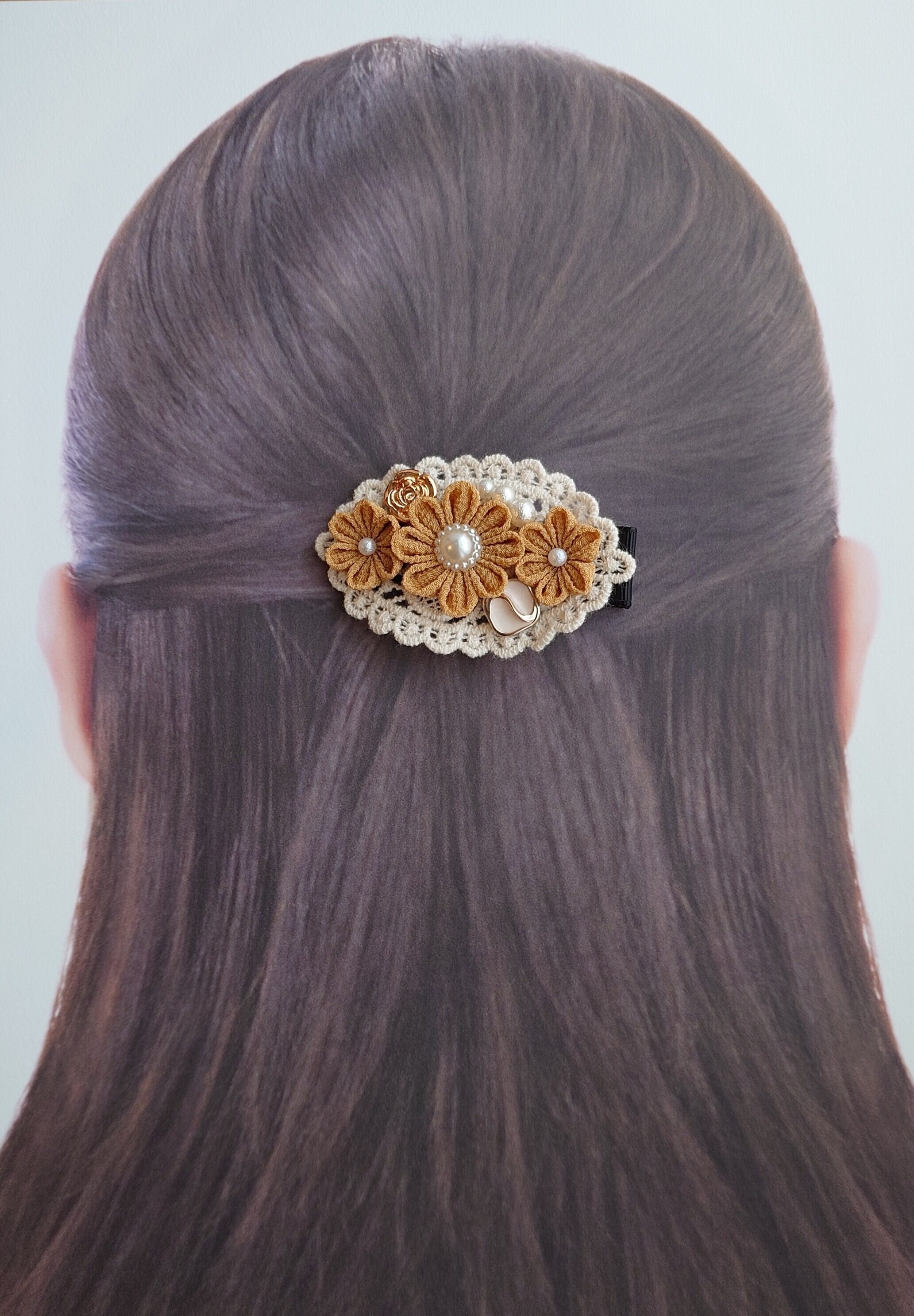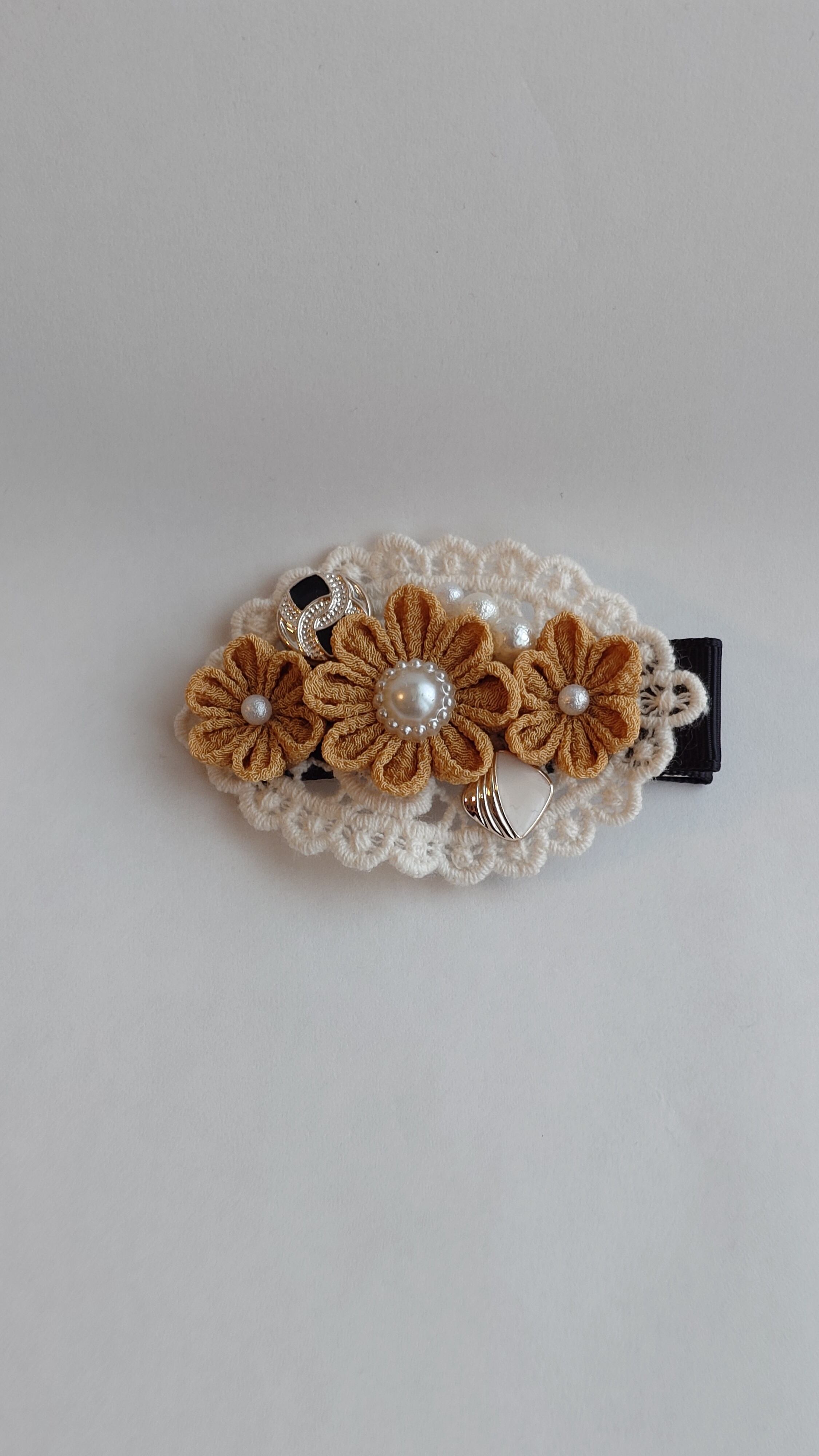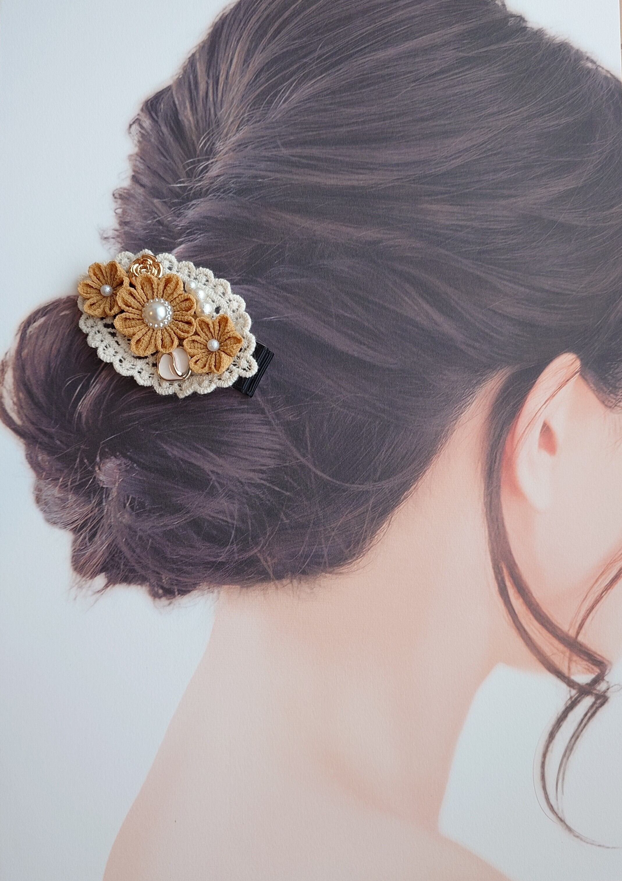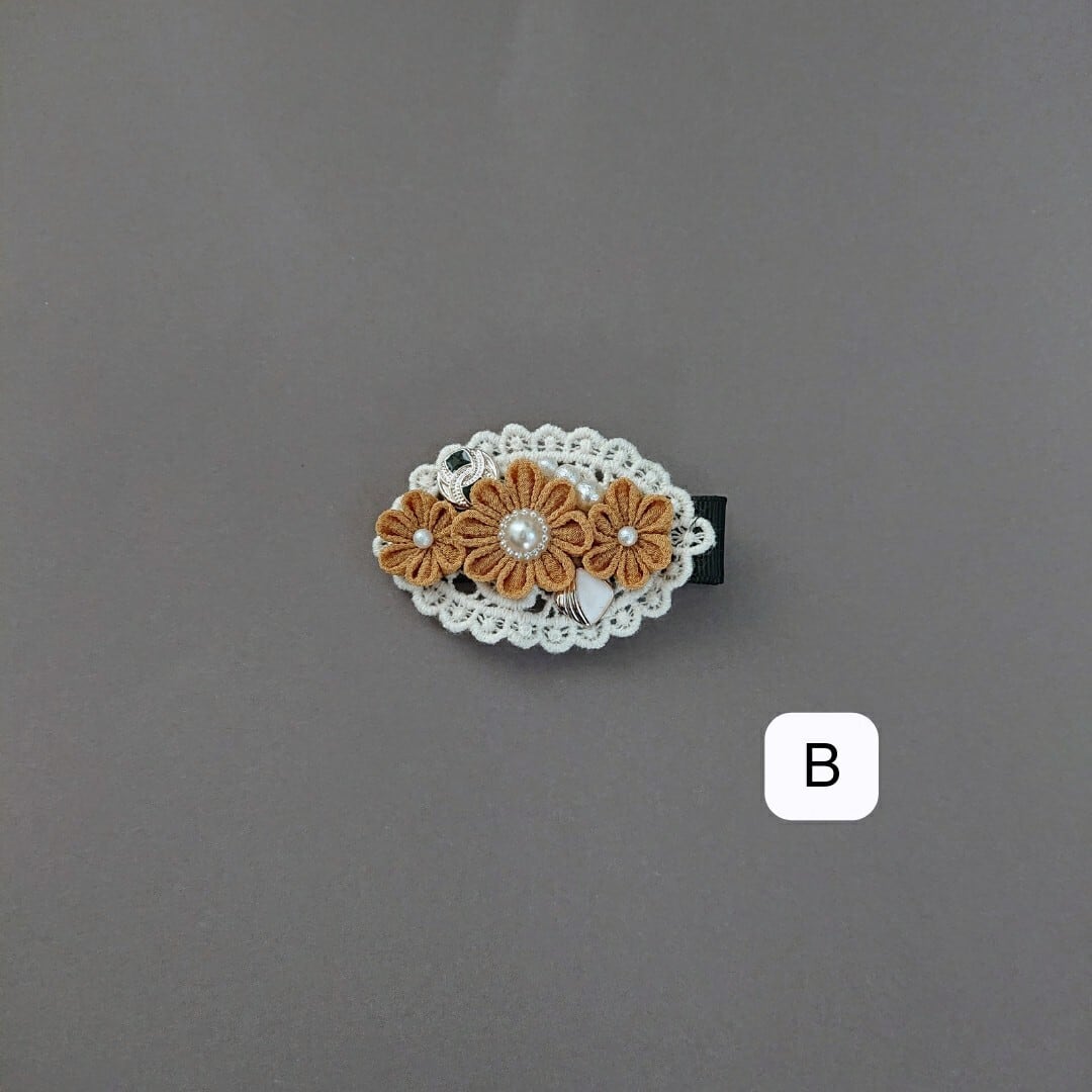 【素材】レーヨン(つまみ細工)、化繊(レース)、ポリエステル(リボン)、プラスチックパール、ボタン、クリップ金具
