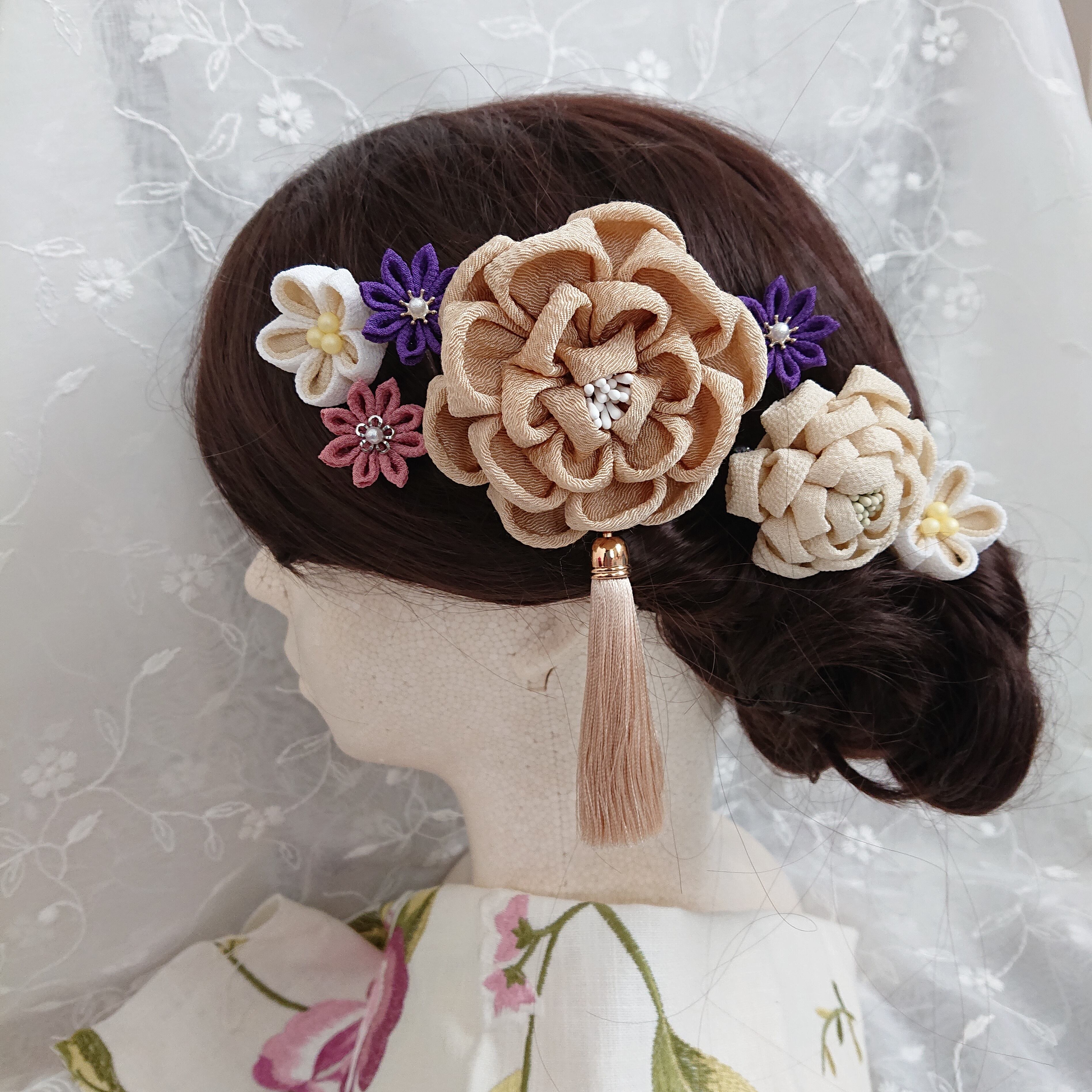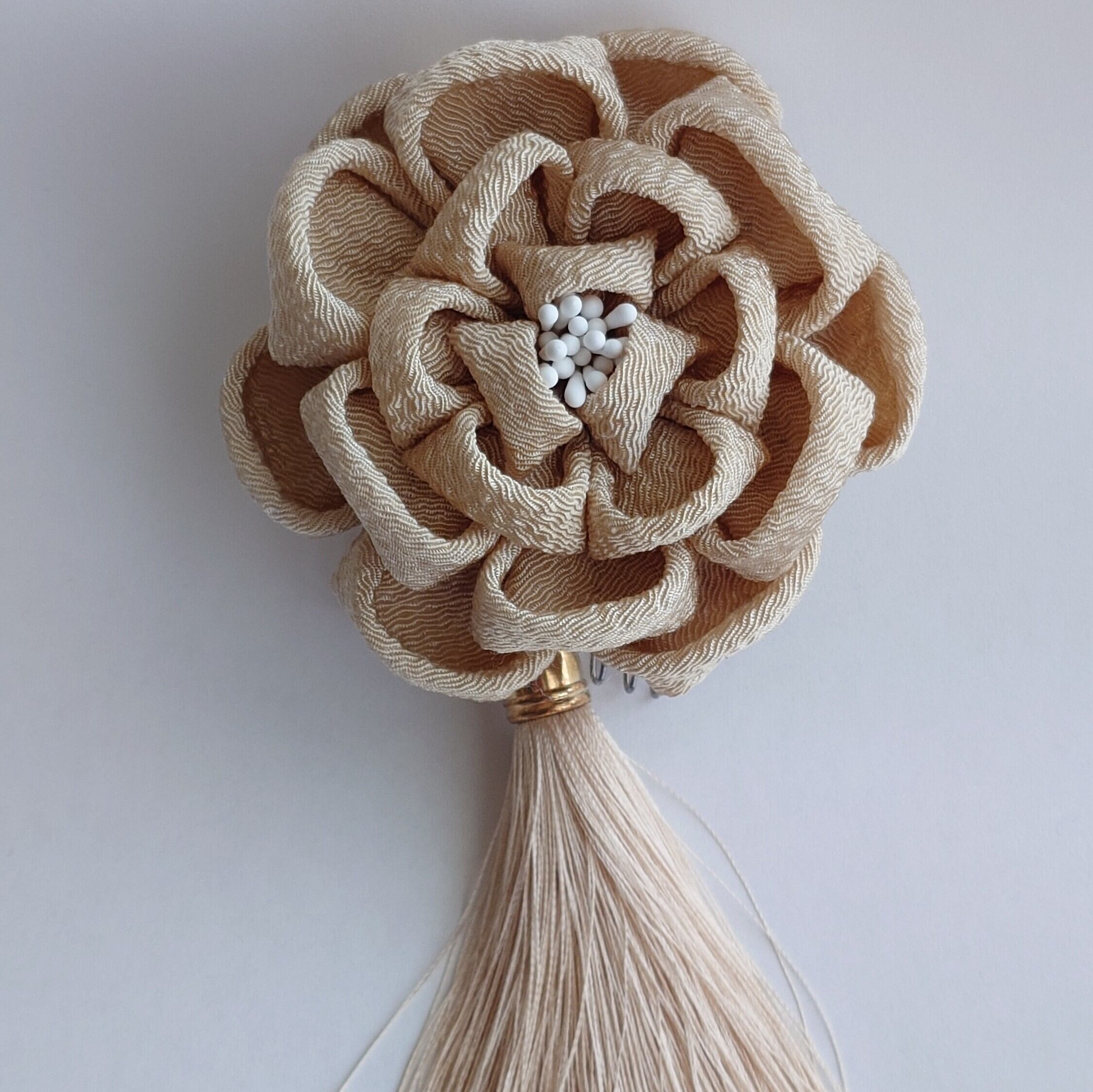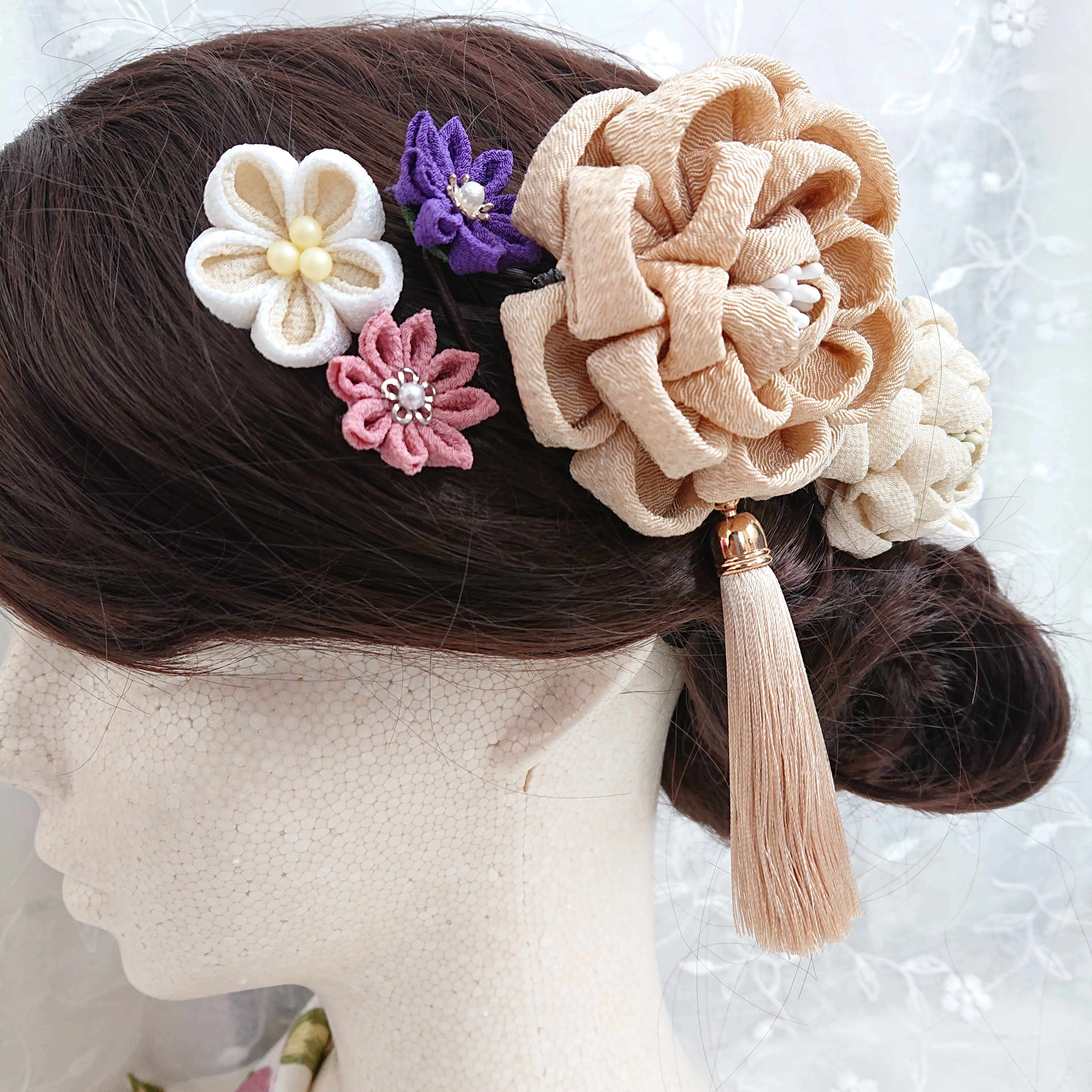 つまみ細工 髪飾りセット タッセル付き ベージュ 成人式
