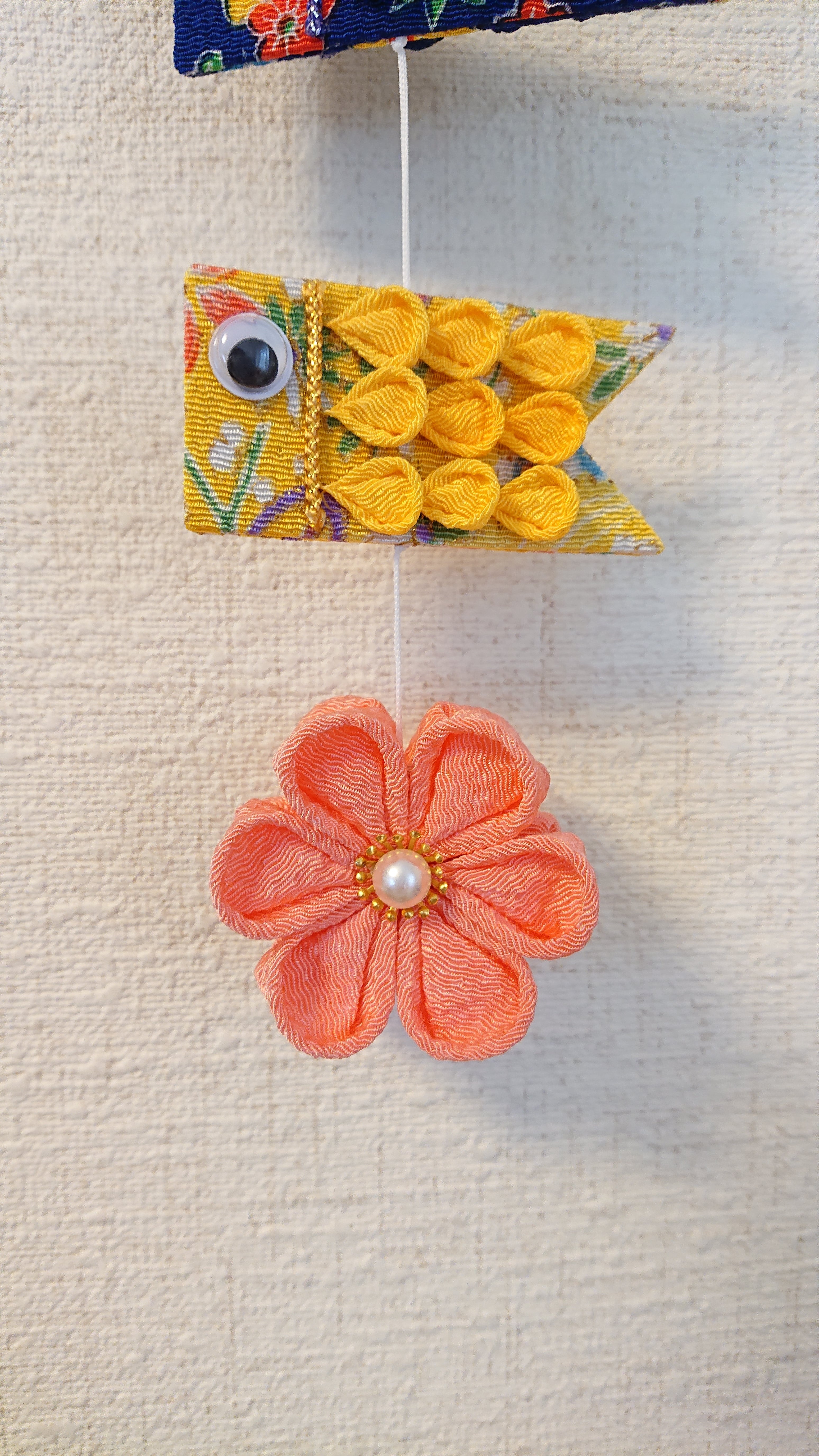 こいのぼりと下のお花は裏表ともつまみ細工で飾ってありますので、立体で楽しめるつまみ細工です。