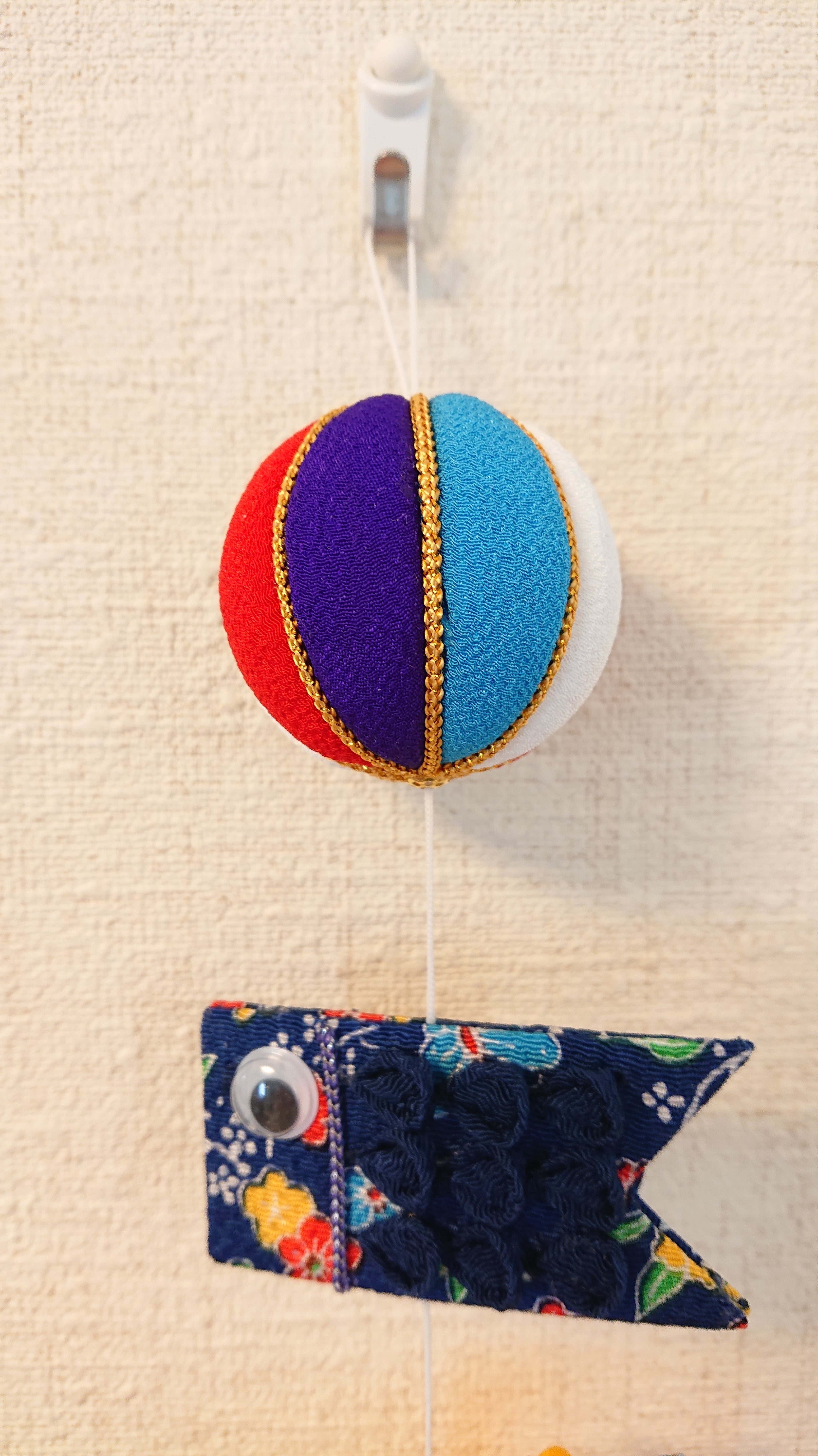 木目込みの鞠とこいのぼり2匹とお花でコンパクトですが華やかに仕上げました。