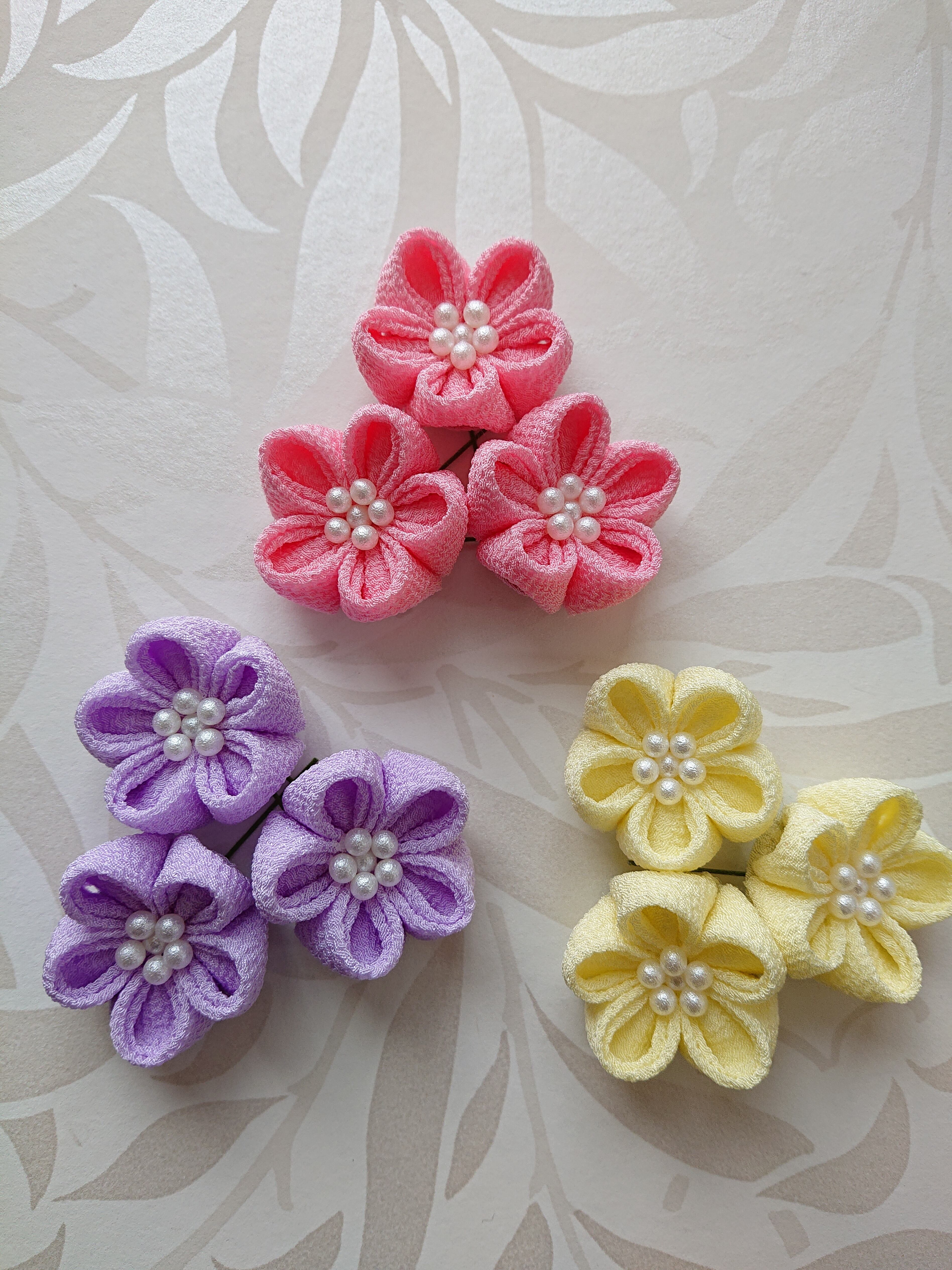 つまみ細工は、水濡れや強い力を加えることにより変形・破損の恐れがありますので、お取り扱いにはお気をつけ下さい。