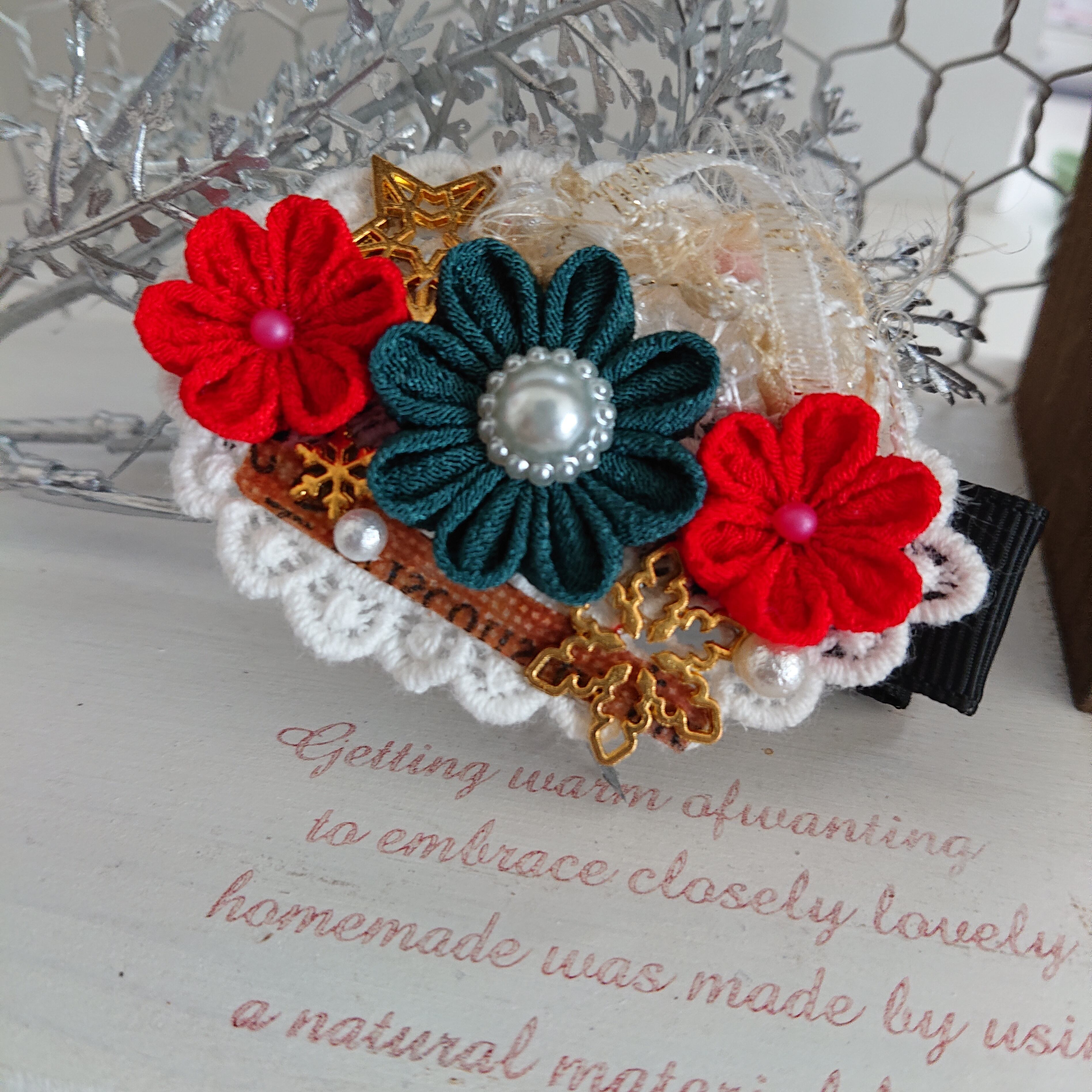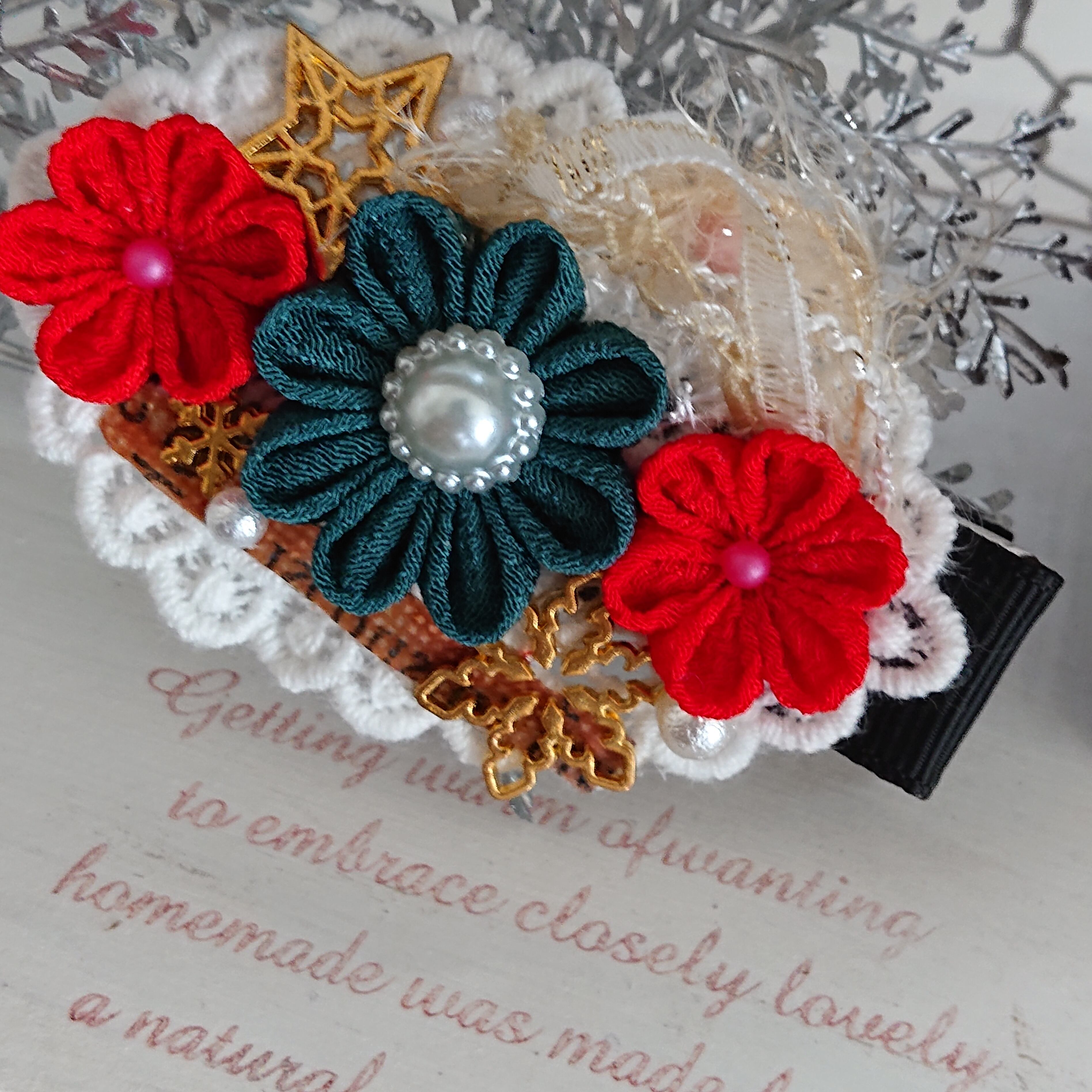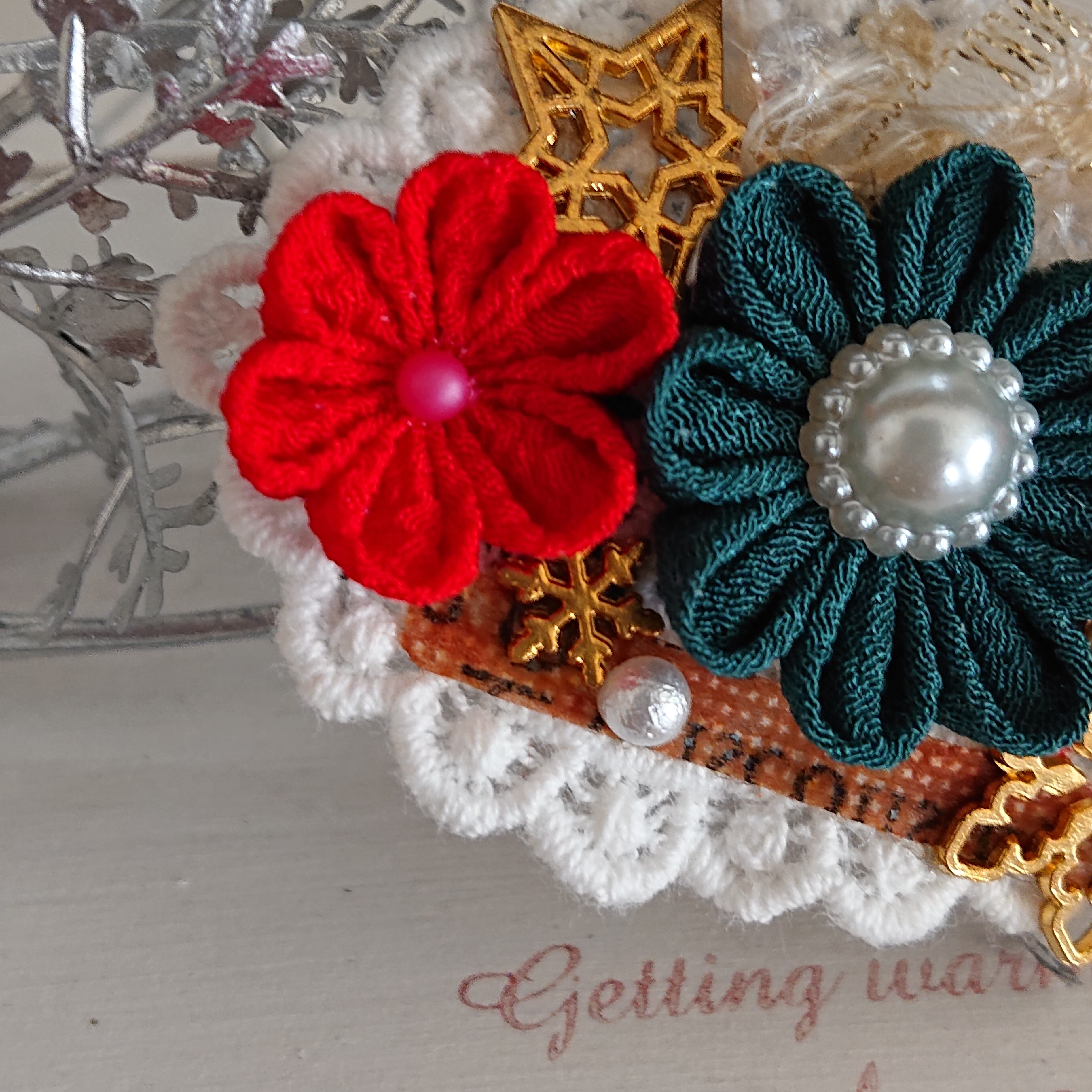 つまみ細工にパールや雪の結晶モチーフと引き揃え糸を組み合わせました。