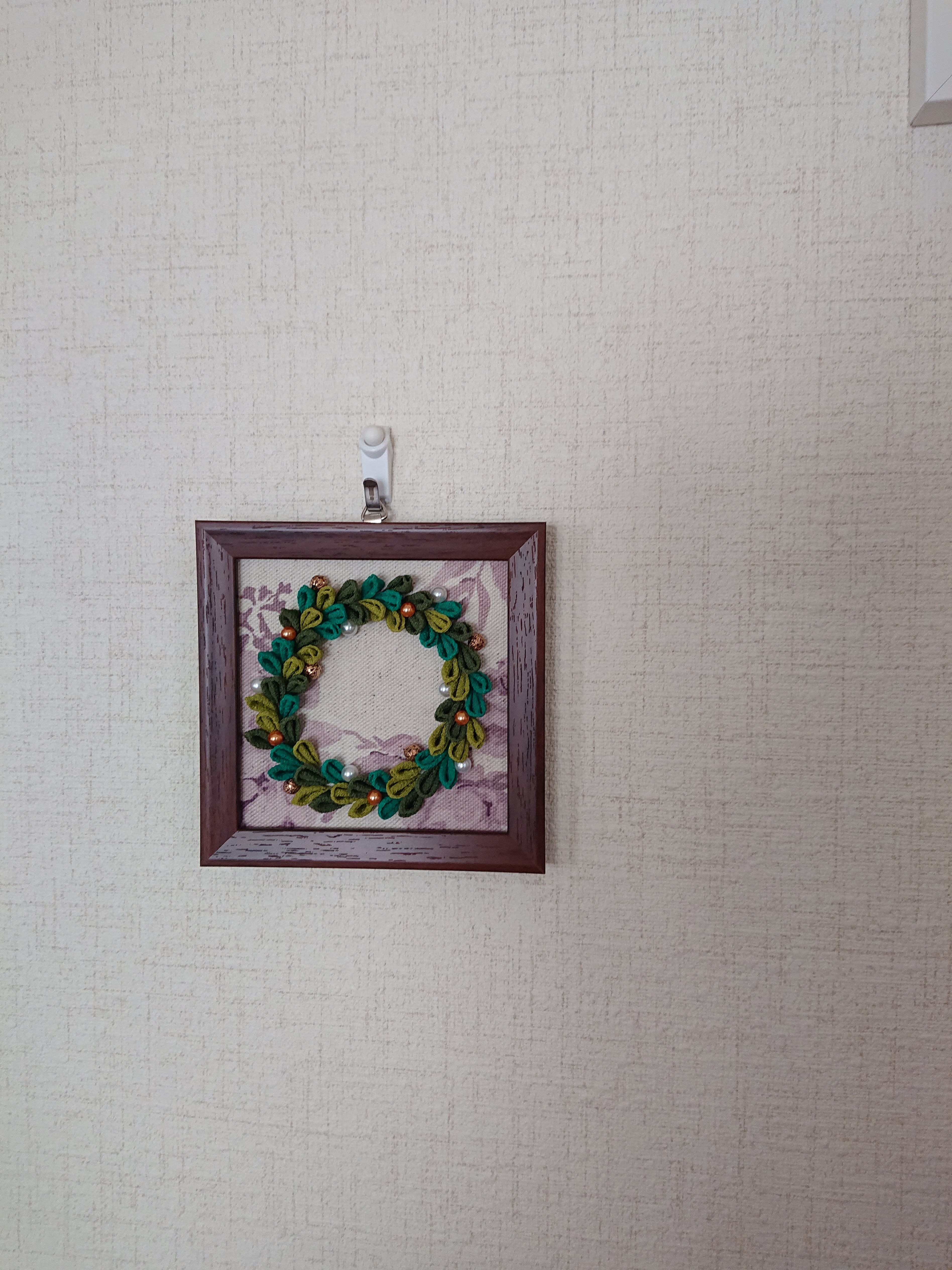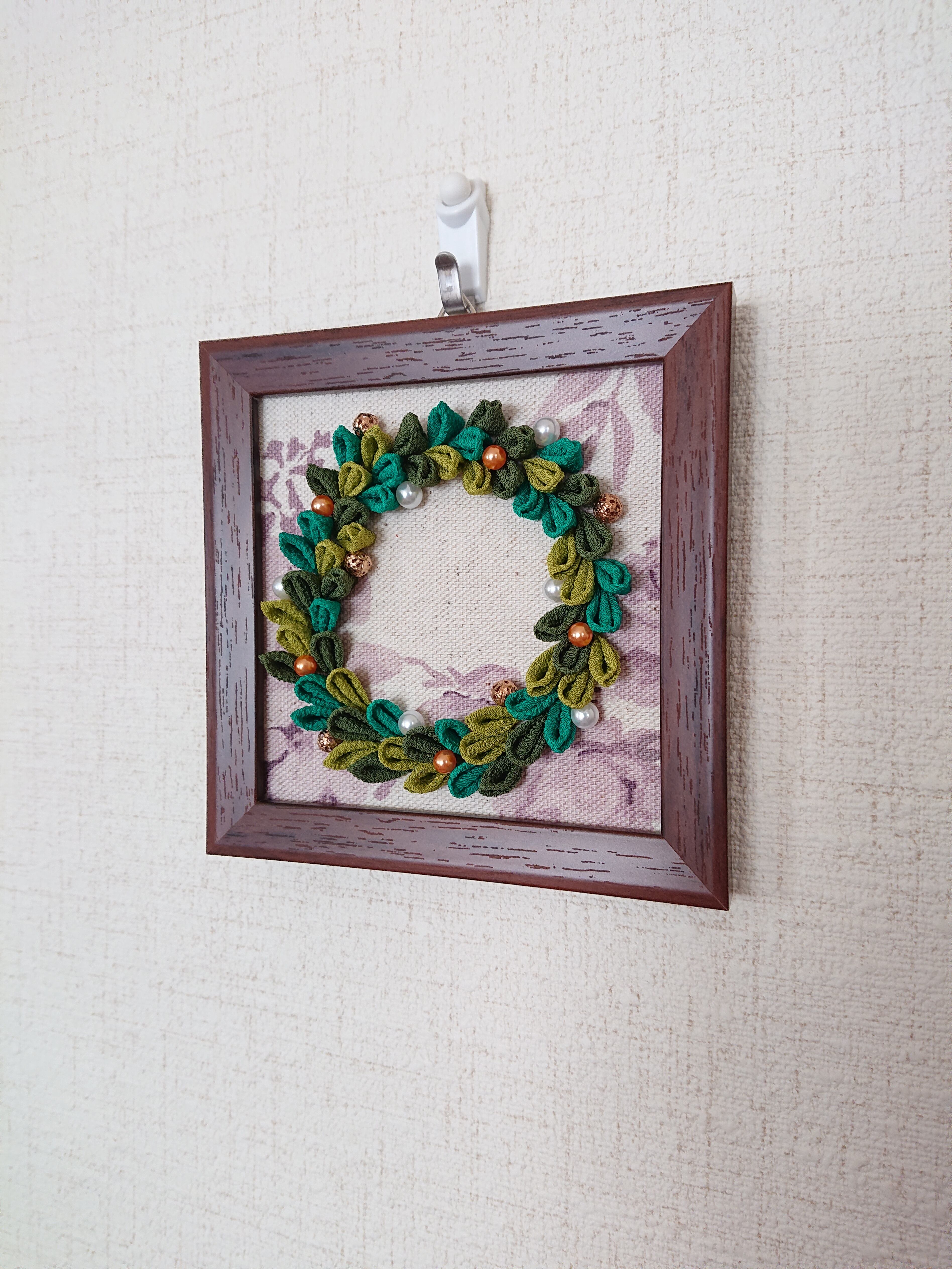 つまみ細工で作ったクリスマスリースのフレームです。