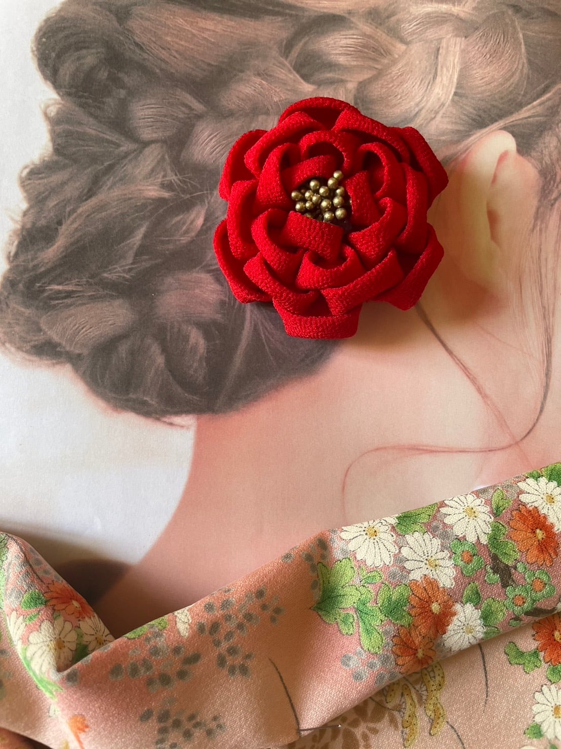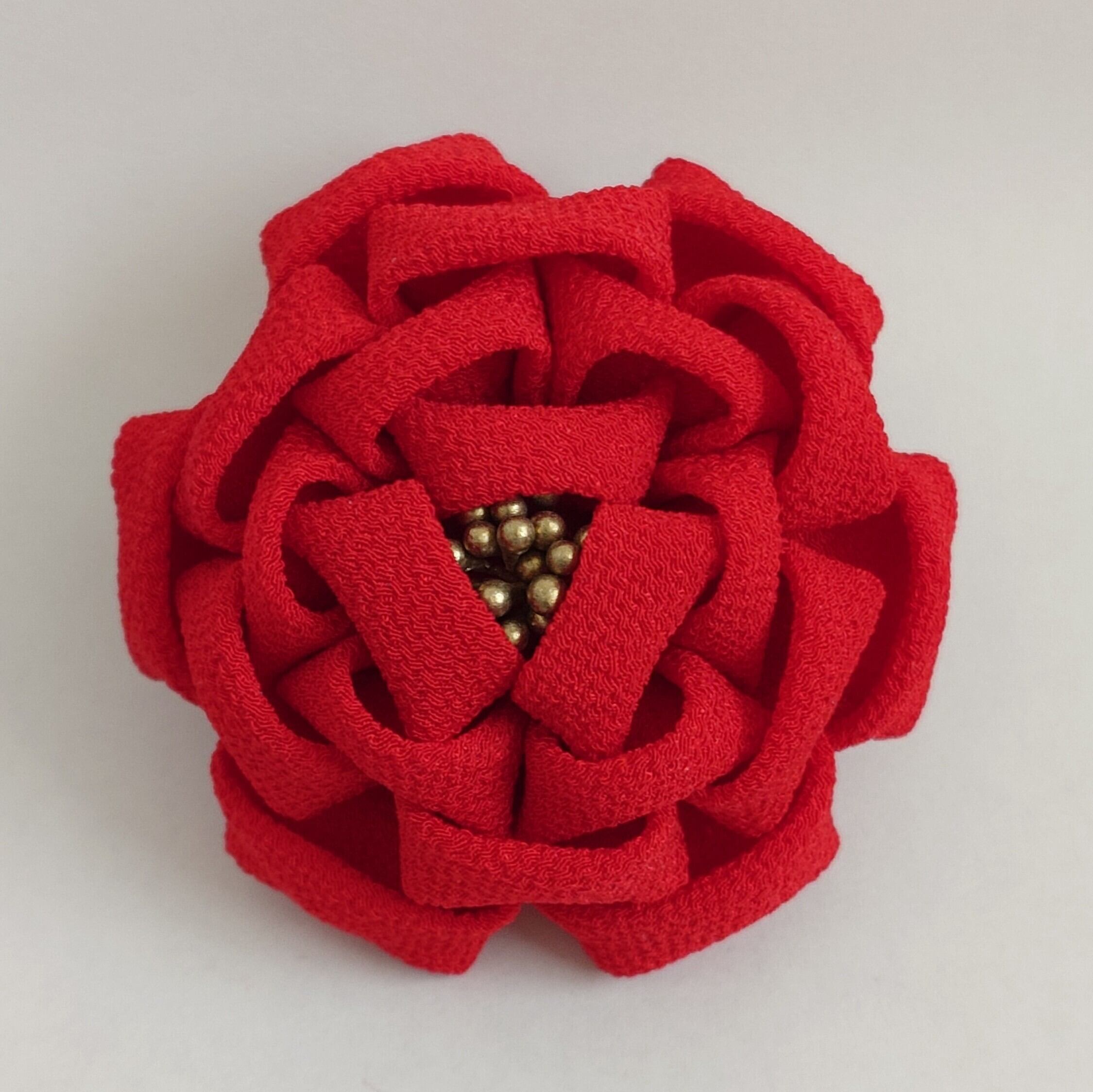 つまみ細工で作った椿の髪飾りです。